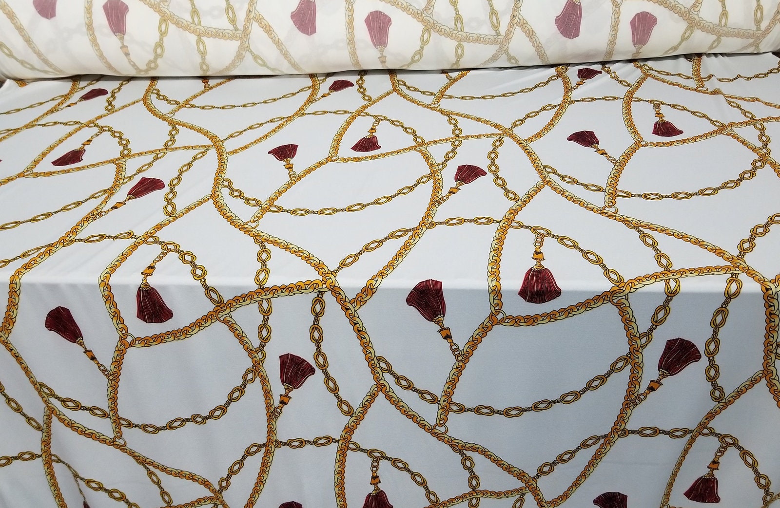 2 Way Stretch Scuba Techno, Color white/gold Chains, Belts and Ornaments burgundy, 58" wide, sold by yard in continuous yards