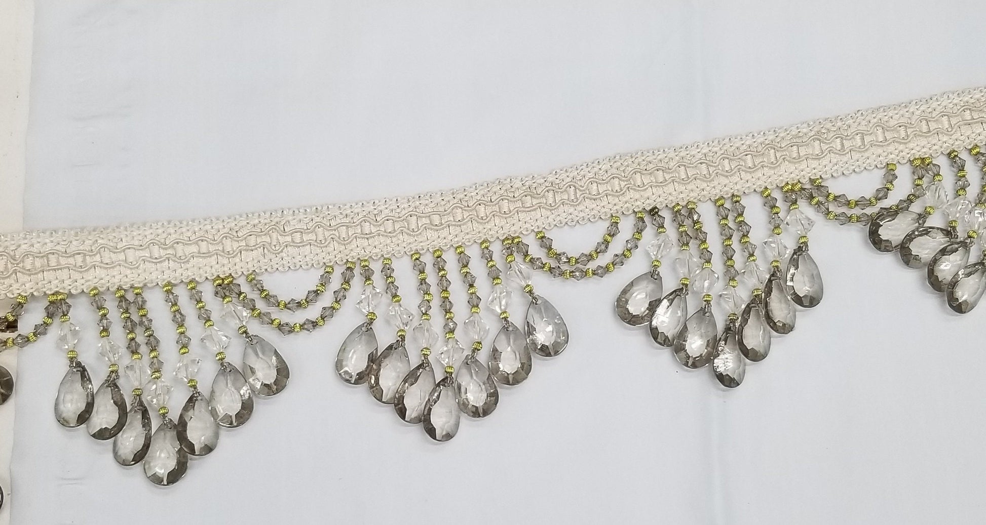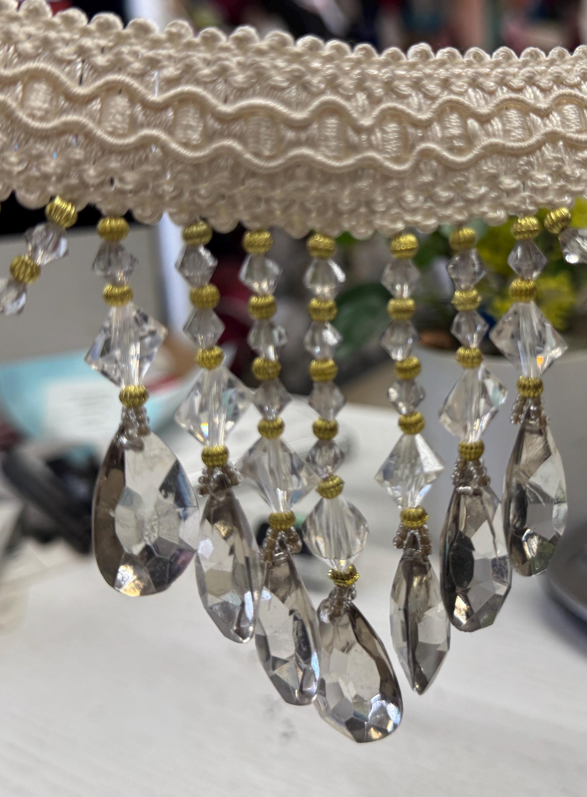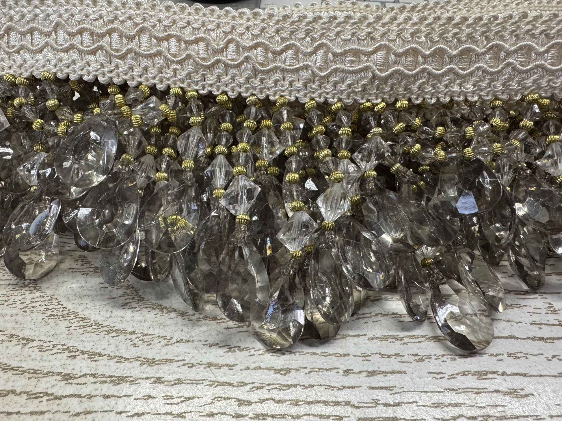is created with dazzling transparent high quality crystal clear acrylic beads mixed with antique gold accent beads. The overall color is more of a soft ivory than clear. Perfect for trimming draperies, valances or accessories
