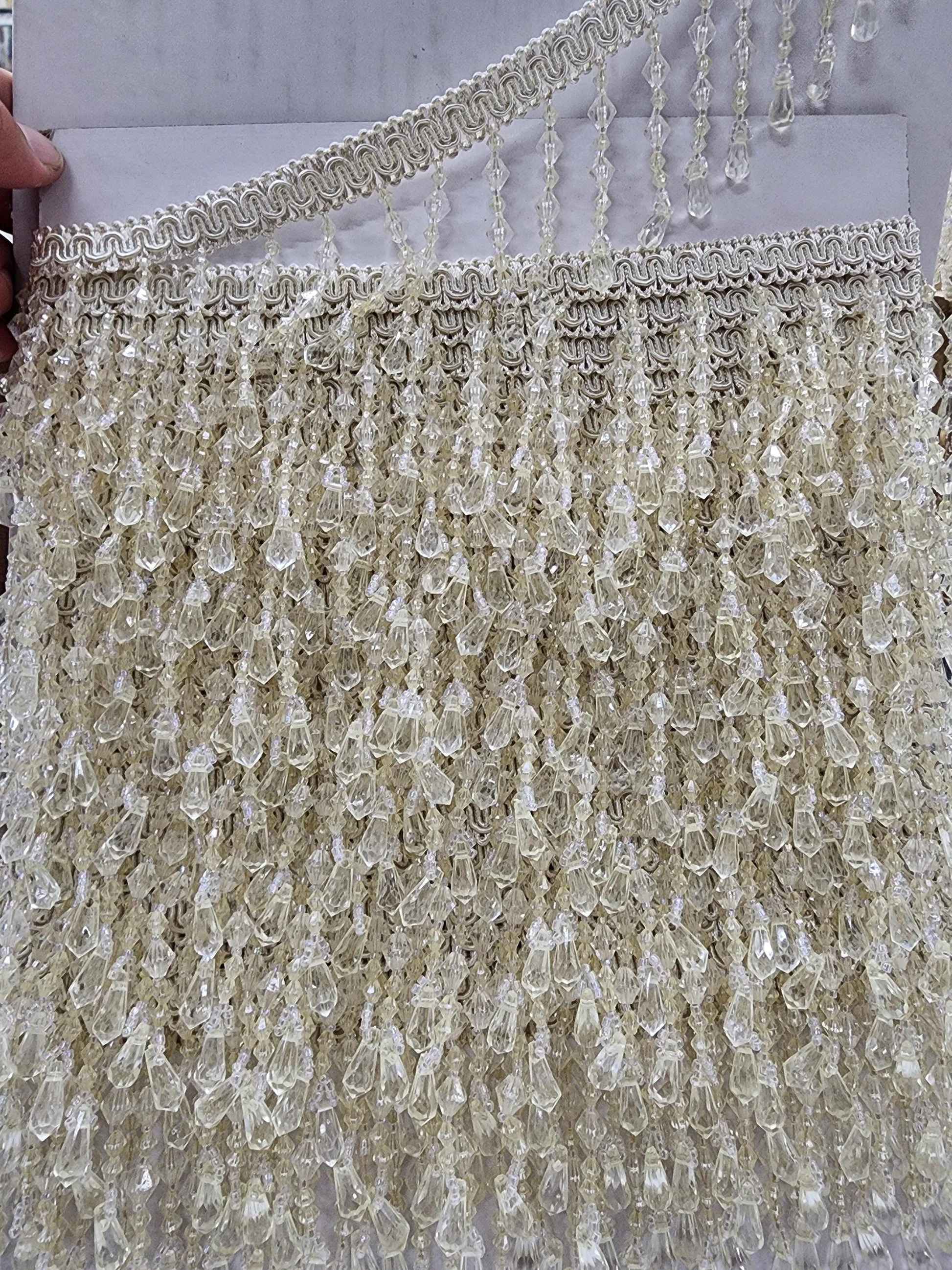 This is a beautiful hand made crystal beaded fringe trim to be used on any type of sewing project. Sold by continuous yard.