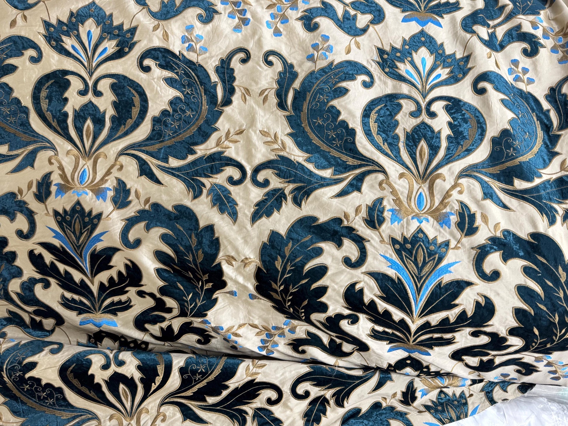 Belgium Designer Faux Silk Taffeta has the most exquisite cut velvet detail a silk could ever have! Intricately detailed blue colored flowers cascade across a cream silk