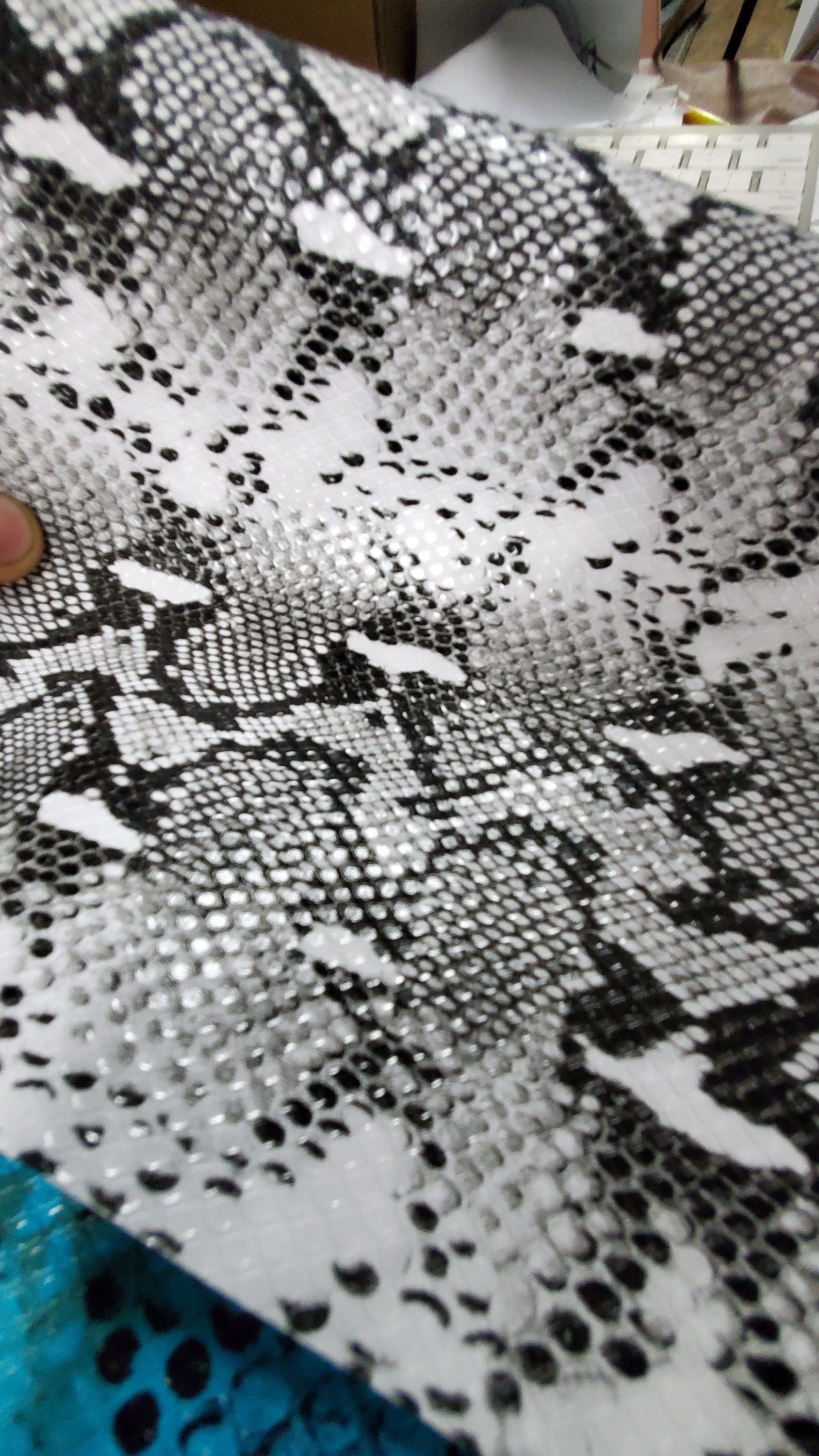 KING COBRA SNAKE PYTHON VINYL HAS A GREAT TEXTURE TO IT. WITH A HIGH QUALITY PVC BACKING TO IT. VINYL CONTENT ARE BOTH PVC AND PU. AMAZING FEEL TO IT. EXTRA HIGH QUALITY VINYL VERY HIGH END QUALITY FABRIC The KING KOBRA Vinyl Fabric feels extremely like the real thing! The exotic pattern looks like real SNAKE! Fabric is embossed, vinyl finish and has texture to it. Use it for theatrical costuming home and commercial upholstery to add some reptilian theme to your projects. Content : PVC PU Width : 56" Wide Weight : 2 lb Per Yard Stretch: SLIGHT Uses: Great use Upholstery, fashion, purses, bags, luggages, motorcycle seats, automotive. Perfect for bar and restaurant seating, headboards or accents, stadium and theater seats. Stylish: Absolutely perfect for mixing with micro fiber suede or real leather. Perfect combination as a coordinate on seat and inside and outside booth. accented with real leather, truly a solid statement to any room's decor. Durability: KING COBRA faux vinyl resists tearing, punctures, stains, and abrasion. A very durable upholstery fabric. Will hold up under almost any conditions and retain its appearance for years to come. Care Instructions: KING KOBRA faux vinyl is remarkably easy to maintain: It requires only occasional dusting and wiping with a damp cloth. Use mild soap and water. Do not use bleach or alcohol based cleaners.